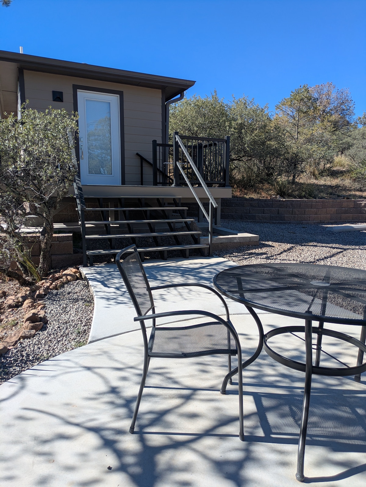 Our tiny Gem meets your basic needs, with multiple inviting outdoor seating areas. There is the deck for seeing distance views. The patio with a table and chairs to eat outdoors. And the special secluded area tucked in the oak and juniper trees on the lower terrace. This brand new tiny home has it all including a full kitchen and bath, with two twin beds in a peaceful neighborhood close to the university and downtown.
