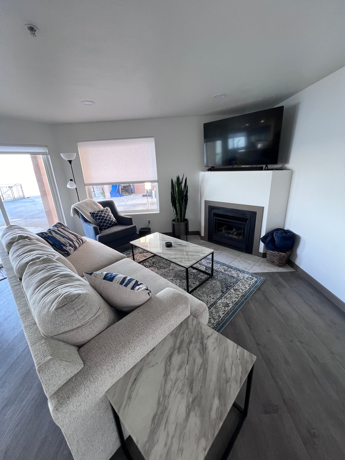 Keep it simple at this peaceful and centrally-located place. One bedroom duplex on right side which is modern and beautiful with tons of parking! Fully stocked kitchen. Couch pulls out to make bed for two! Rent this bungalow and if more room is needed rent the other side! Fully fenced with gas fire pit in yard to utilize! Private and peaceful! Within one mile of two golf courses. Lake across the street. City park with boat launch.Five miles from sand dunes! Close to the Gorge for concerts!