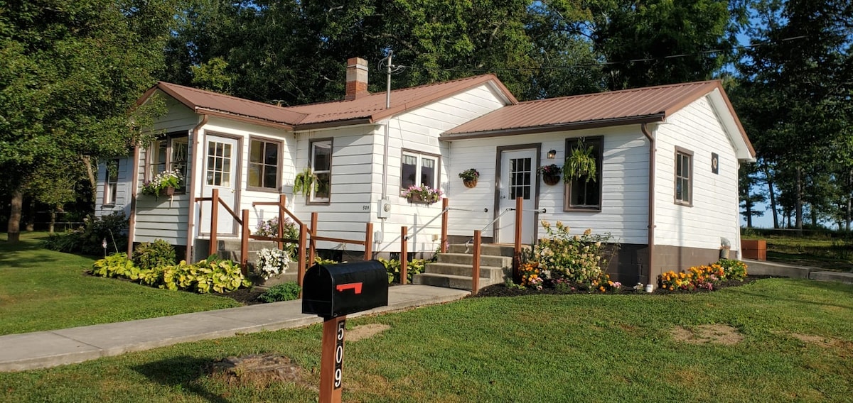 three bedroom home with a large front porch. It sits behind a small country church so it is peaceful. There are three bedrooms and two full bathrooms. The bathroom in the master bedroom has a walkin shower and a shower seat. The living room and all three bedrooms have televisions. this house sits about two miles from beautiful South Mill Creek Lake and 8 miles from Smoke Hole. The house has starlink and it works really well. There is also a landline phone.
