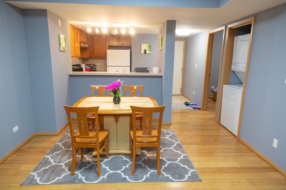 Visiting Northwestern, Loyola University, Rogers Park or Evanston? This cozy AirBnb is perfectly situated. A beautifully clean, private apartment 2 blocks from parks & sand beaches, walking distance to Loyola, short ride to Northwestern, steps to public transportation & restaurants, red line "El" trains & bus routes. Apt has private, queen bedroom, en suite full bathroom, living room w/queen sofa bed, TV, dining table, & partial kitchenette. NOTE: No full kitchen.