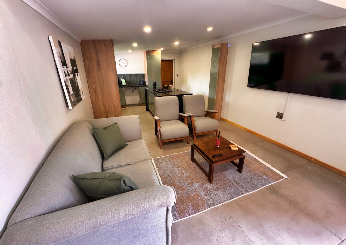 Elegance and convenience! A beautiful, new 55 sqm loft suite located in a quiet cul-de-sac on an 18 hole golf estate. Enjoy peace of mind with top notch security and solar power so you never have to worry about power outages. Private entrance. Relax in a luxurious queen-size bed, the finest Egyptian cotton linens and plush goose down duvet and pillows. Kettle, microwave and fridge, enjoy quality filter coffees, teas and rusks. Flatscreen TV with full DSTV package and fibre wifi.