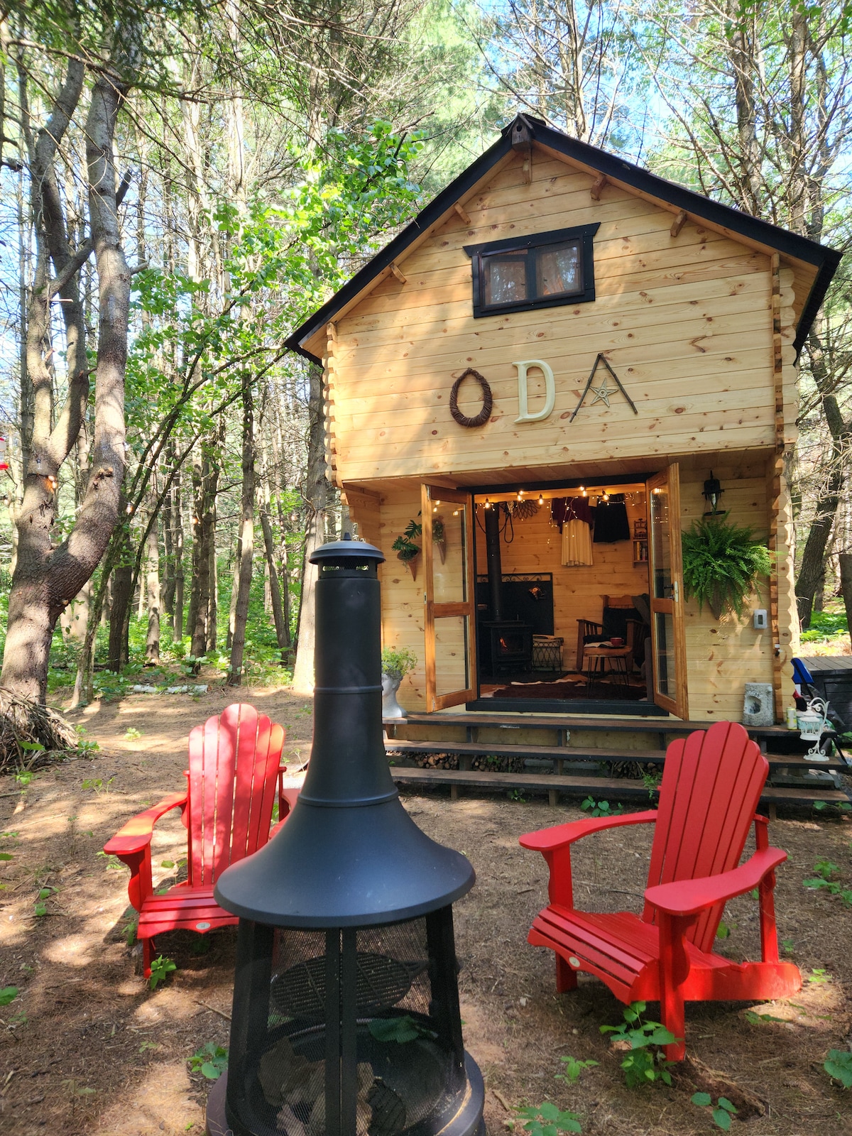 Welcome to the Georgian Oda Log Cabin at Zukaland, a charming forest retreat nestled among mature pines in Muskoka. This Georgian-style tiny log cabin sits on a scenic forested cliff and offers easy access to a private sandy beach by the river. Guests may enhance their stay with optional add-on experiences, including our Cedar Outdoor Spa with wood-fired hot tub and sauna. As evening falls, cozy up by the crackling warmth of a real wood stove and unwind in nature.