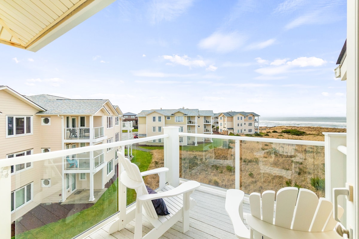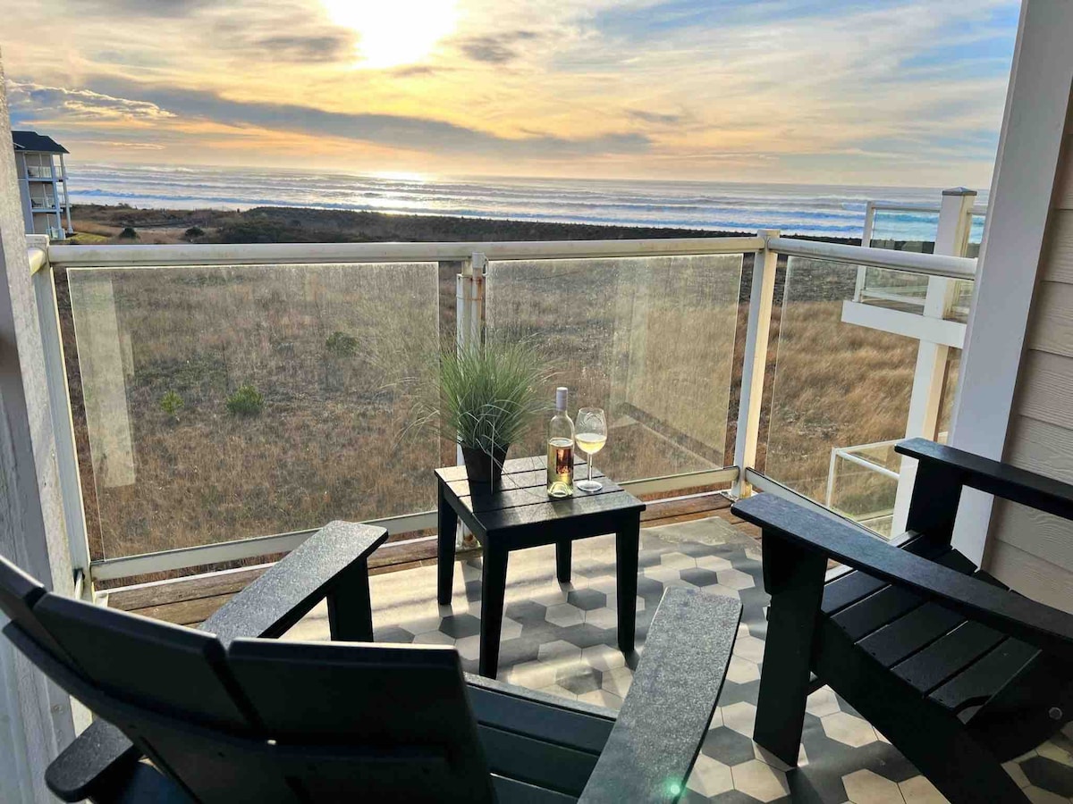 Dive into beachy vibes in this top floor, ocean front condo overlooking the breathtaking Pacific Ocean. Wake up to soothing waves, sleep in the sunset glow or take in the energy of a wild storm or king tide. Enjoy miles of pristine beaches on foot or take the gentle ADA paved path next to the ocean on foot, in your wheelchair or bike. Play in the seasonal heated saltwater pool (May-Oct. 13th) year-round spa, workout rm, clubhouse, BBQ area, pickleball/basketball court, putting green & more.
