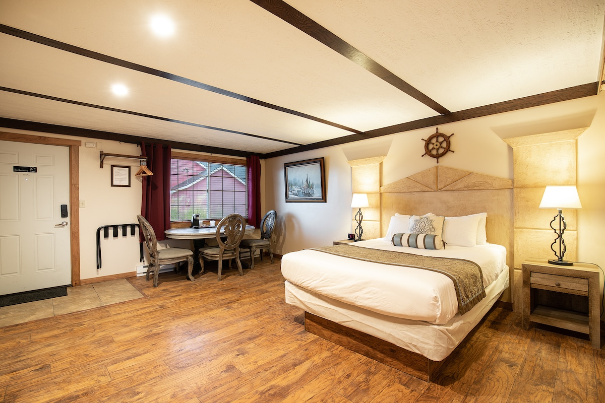 Relax, enjoy the quiet or take a quick walk to the beach! With views of Main Street, fun nautical decor, shiplap accents, and a plush queen bed, you will feel welcome in no time. This HOTEL ROOM is equipped with a coffee maker, mini-fridge, and microwave. Located within walking distance to the beach, convenience store and the Navy Getaways. Close to Seabrook shopping and dinning. *Please note - If you are planning to make or heat up meals, you will need to provide your own plates, etc.