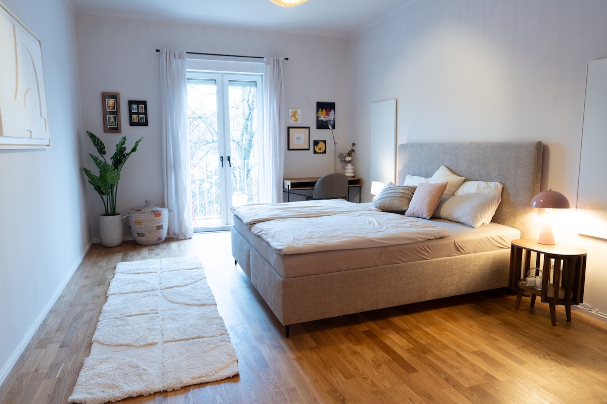 Fühl dich wie zuhause! Die ideale Unterkunft für dich - egal ob für die Arbeit, Eventbesuche oder ein Städtetrip mit deinen Liebsten. Die liebevoll eingerichtete Altbauwohnung umhüllt dich mit ihrem Charme - und das ab dem ersten Augenblick. Mit Liebe zum Detail wurde auf alles Rücksicht genommen, was du bei deinem Aufenthalt brauchst. Neben der voll ausgestatteten Küche, großem Wohnzimmer und einem modernen Arbeitsplatz (High Speed Wifi) bietet die Wohnung dir ein tolles Bad mit Waschtrockner.