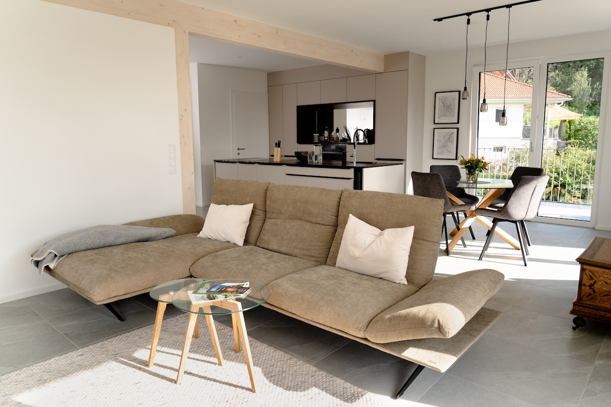 Welcome to your modern and cozy suite. The accommodation offers everything you need for a relaxing stay: free parking, Wi-Fi, Netflix, a fully equipped kitchen, washing machine, dishwasher, hairdryer, iron, oven, stove, toaster, microwave, kettle, and coffee maker. The bus stop is a 10-minute walk away (14 minutes to the city center). The highway exit is also very close by. The area is very quiet. We look forward to welcoming you!