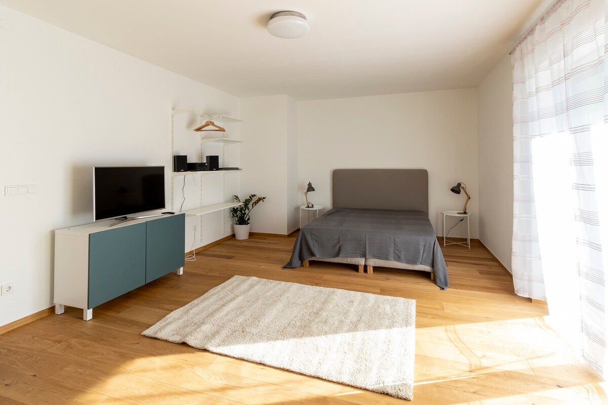 Diese stilvolle Unterkunft eignet sich hervorragend für Gruppenreisen, für Geschätsreisen aber auch für längere Aufenthalte. Die 100 qm große Wohnung ist mit allem was man für einen angenehmen Aufenthalt braucht ausgestattet. Die Wohnanlage bietet einige Dachgärten zur Nutzung, zum Energietanken oder aber auch um die tolle Aussicht zu genießen. Wer mit Fahrräder kommt, erwartet ein riesiger Fahrradabstellplatz, überdacht und versperrbar. Eine zusätzliche Matratze ist im Apartment vorhanden.