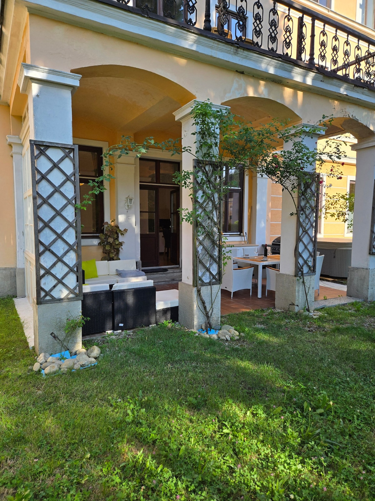 Luxuswohnung 110m2 mit kleinem Garten 350m2 und Whirlpool. Kaiserlicher Altbau neu saniert mitten in der Altstadt Graz Geidorf.Genieße ein stilvolles Erlebnis in dieser zentral gelegenen Unterkunft. 2 Schlafzimmer. 2 Badezimmer und 2 WC. Wohn-Essbereich 45m2, Moderne, kleine Küche mit Geschirrspüler, Induktionsherd, Kaffeemaschine, Waschmaschine. Waschmaschine mit Bügelbrett und Bügeleisen.Griller und Essbereich im Freien, Whirlpool, 2 Parkplätze. 5 Minuten zu Fuß zum Hauptplatz