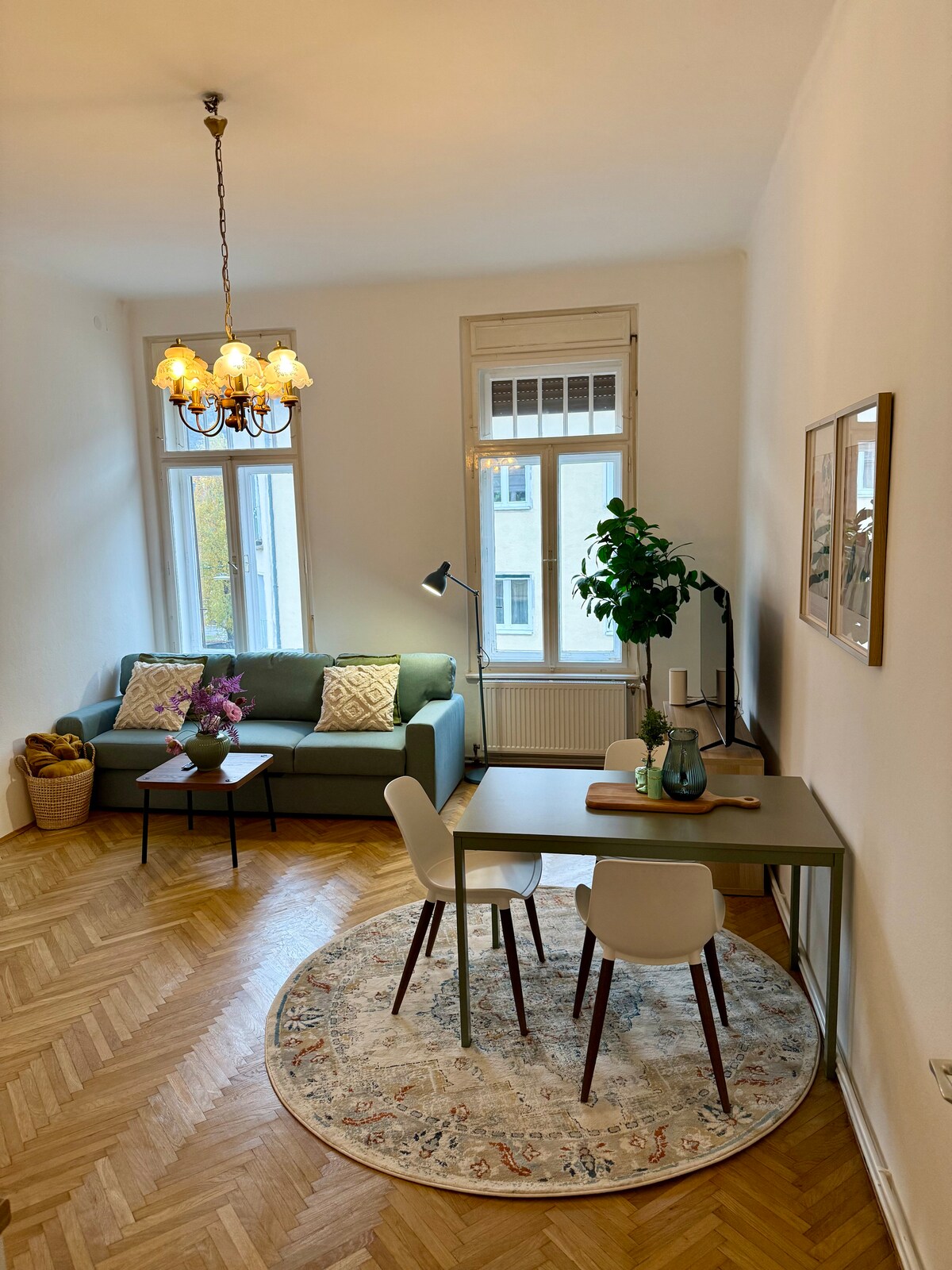 Fühl dich wie zuhause! Die ideale Unterkunft für dich - egal ob für die Arbeit, Eventbesuche oder ein Städtetrip mit deinen Liebsten. Die liebevoll eingerichtete Altbauwohnung umhüllt dich mit ihrem Charme - und das ab dem ersten Augenblick. Mit Liebe zum Detail wurde auf alles Rücksicht genommen, was du bei deinem Aufenthalt brauchst. Neben der voll ausgestatteten Küche, großem Wohnzimmer und einem modernen Arbeitsplatz (High Speed Wifi) bietet die Wohnung dir ein tolles Bad mit Waschtrockner.