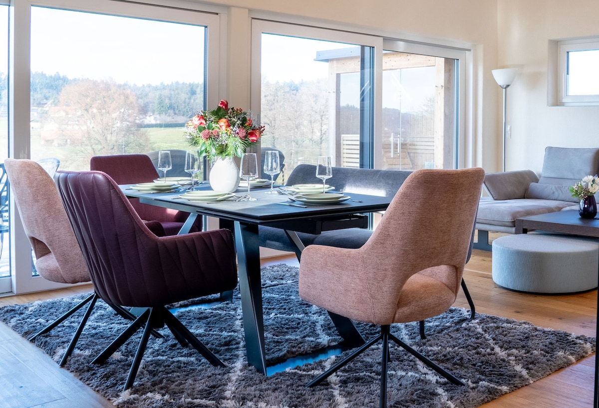 Away from the hustle and bustle of the Schilcher Wine Road, Domizil Vochera am Weinberg is situated on a hill with a breathtaking view of the Western Styria. Here, you can unwind and enjoy the peace and quiet. The property offers ample space for unforgettable holidays with friends or family, with no shortage of luxury – featuring a pool, whirlpool, and sauna for ultimate relaxation and rejuvenation amidst nature.