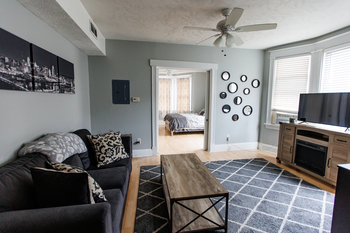 Cozy studio at street-level apartment (dog friendly) in the heart of Mainstrasse Village, just 2.5 miles from Cincinnati. Newly renovated with a queen bed, full kitchen, smart TV, and modern amenities. Walk to local shops, restaurants, bars, and live music venues. The Reds/Bengals stadiums and Duke Energy Center are minutes away. Enjoy outdoor seating and a comfortable stay in this charming 19th-century neighborhood!