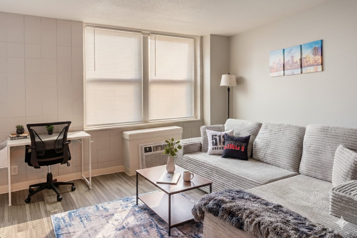 Cincinnati studio just steps from UC, dining, and campus shuttles. Enjoy fast WiFi, comfy beds, and rare free parking, all in a professionally cleaned, pet-friendly space. Ideal for work trips, medical rotations, or easy weekend stays with everything you need! *Conveniently located only a 3-min drive or a 15-min walk from the University of Cincinnati College of Medicine* Just 3- 6 minutes from - Downtown - OTR - The Banks - Paycor Stadium - Great American Ball Park - Hard Rock Casino
