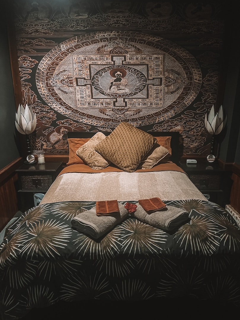 Whitsundays Retreat— “A tranquil Buddha-themed garden room featuring a carved wooden entrance, calming mandala wall and warm, atmospheric lighting. Set within landscaped tropical gardens with access to a unique shared bathroom with pebble floors and mosaic shower. A peaceful, beautifully styled space to unwind after exploring the Whitsundays.”