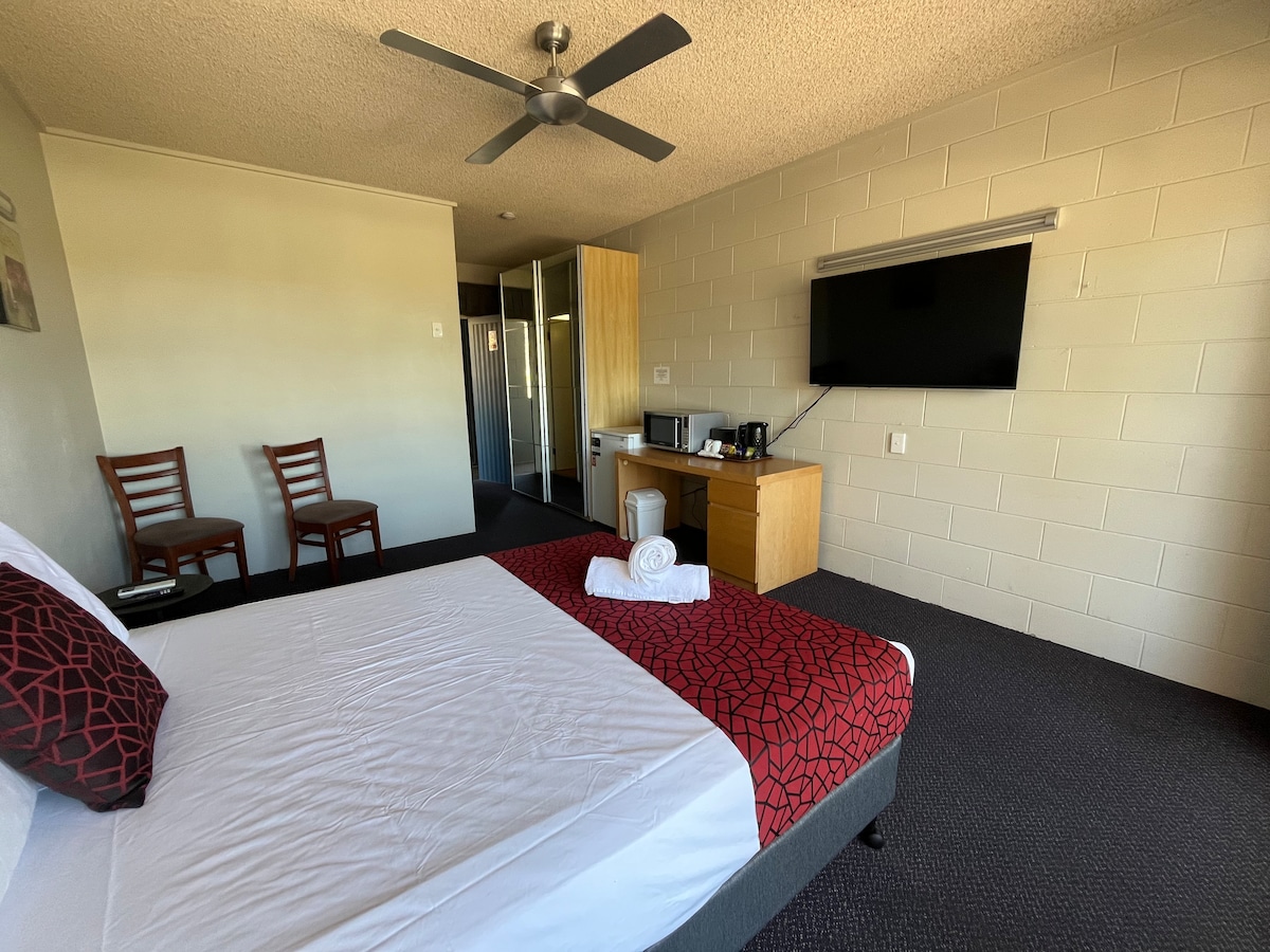 This Queen Room located at the Midlander Motor Inn is on the fringe of the CBD and is walking distance to restaurants, cafes, shops and the visitor information centre. Finished to a 4 star standard, the room has a spacious disabled access bathroom two king single beds, indoor dining area, microwave, kettle, toaster, air conditioning, TV and undercover parking. There is access to the motels pool, Wi-Fi and Foxtel.