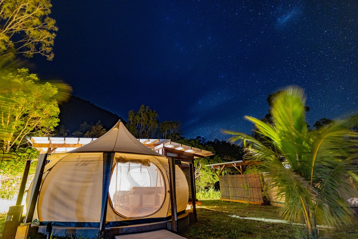 Reconnect with nature at this unforgettable escape. Have you ever tried glamping? That is camping with real bed and 240w power, and no need to put up and pull down the tent. The full camping experience without s hassle?These cozy tents are located next to Bakers Creek Waterfront in Mackay Region, Queensland . Each tent has 2 King size beds with fresh linen ,2 fans light and power, Unlimited WiFi, 2 person outdoor settings with full access to the camp kitchen with refrigerator, TV and BBQ area.