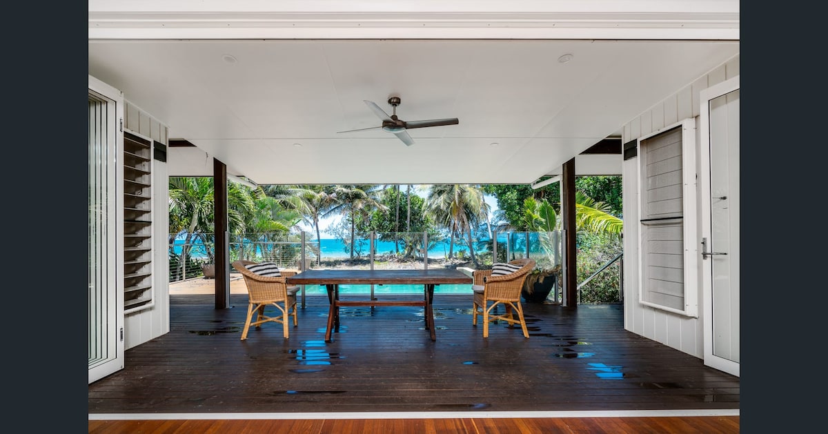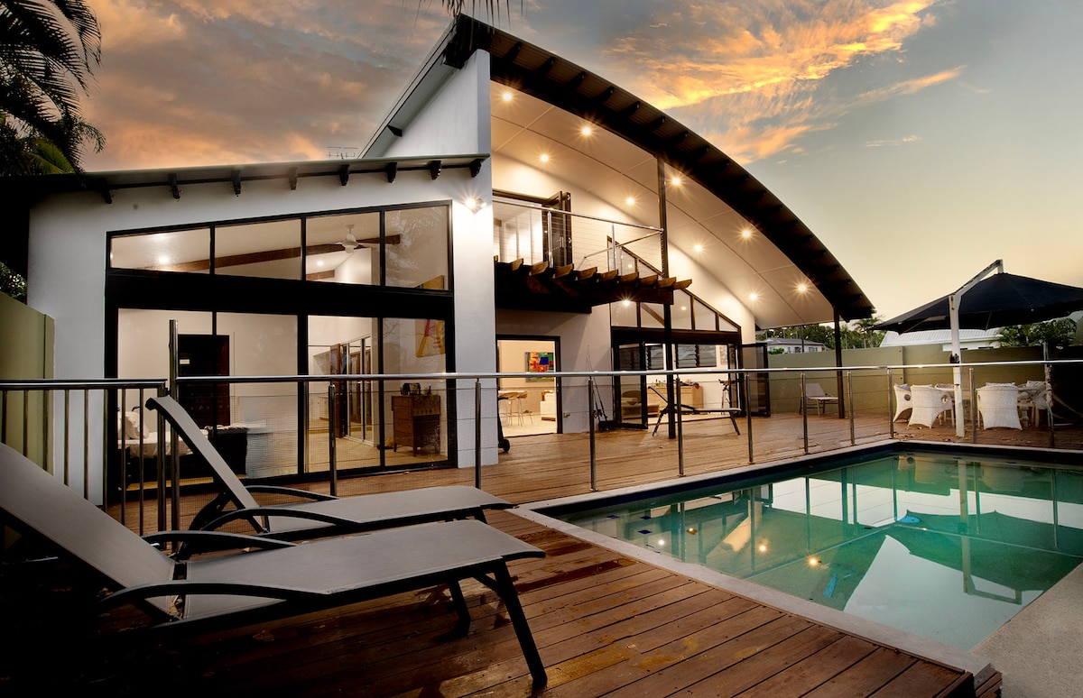 Wake up to the birds, enjoy spectacular 200-degree views of the Coral Sea, Snapper Island and the Daintree Coast. Immerse yourself in the 20m swimming pool inspired by nature and surrounded by lush palms in total seclusion. The interior is simple and open with lush views all around. Double story with 3 bedrooms upstairs. This Nature lovers Retreat is located midway between Cape Tribulation and Port Douglas across the road from the ocean, 10 minutes north of Mossman. 1.5hrs north of Cairns.