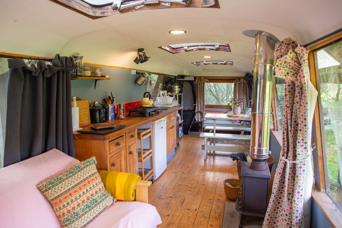 The bus has travelled over half a million miles, only to wind up here. I converted it during lockdown #2, and spent a few months living in it last winter, lighting many fires and seeing the occasional otter. The space is solely yours, in a little woodland nook hidden a field deep from the road, you won't see anyone or visa versa. It's also fully fenced, for your pets to enjoy a run around. Both the coast and the relative wilderness of Dartmoor are 30 mins away. Enjoy some stars ✌🏻