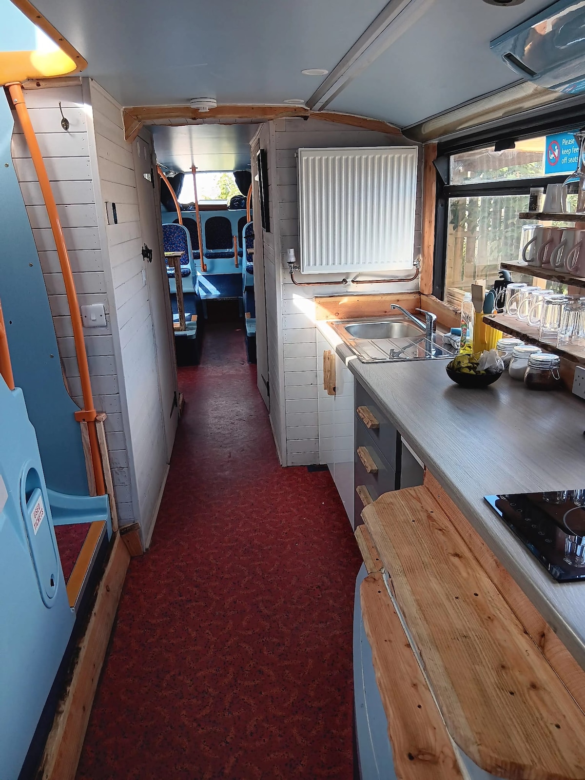 Walter, a Denis Dominator Bus, is creatively designed and fitted with modern and upcycled materials, focusing on warmth and comfort. Walter accommodates four people in a double room, a small double sofa bed, and a single sofa bed. We can provide a cot. Ideal for two adults and 2 or 3 children. Walter is situated in her field surrounded by trees, with a sunken wildflower garden, Bar B Que, patio and heaps of outside space where wildlife thrives and the steam train occasionally passes.