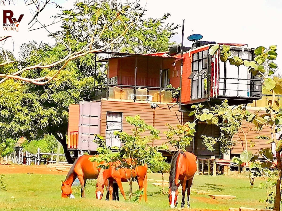 Nestled on the Sagana River in Kirinyaga & foothills of Kiambicho Hills in Muranga, this modern container living is at the heart of the white water rafting Mecca. We are neighbours to the famous Savage wilderness white water rafting location. We are just over an hour from Nairobi and only 45minutes after the duel carriage is complete. The design is spectacular with all the modern amenities in an idyllic farming and riverfront context. We also have stables and dog kennels for animal lovers.