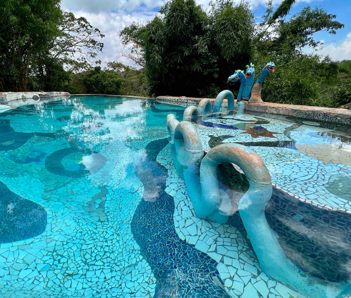 This unique Gaudi inspired home will fill your mind with light & colour. With 1 bedroom (on the upper level), & access to one of the most iconic swimming pools on the planet - this is a stay you won’t forget. Kitchen & bathroom are completely mosaiced in mirror - there is a small lower breakfast patio (all accessed by outside stairs from the bedroom). An upper balcony for sundowners has stunning views of Silole Sanctuary across the gorge. An extraordinary space - a feast for the eyes.