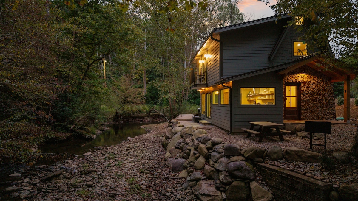 Escape to this Waterfront Luxe A-Frame Chalet — a stunning 3-bed, 3-bath architectural retreat that sleeps 10 just minutes from the Great Smoky Mountains National Park. Enjoy a private riverfront beach, outdoor hot tub, and fire features under the stars. Inside, discover soaring ceilings, custom cabinetry, heated floors, and hand-laid stonework surrounded by massive boulders, mountain landscaping, and panoramic river views — pure Smoky Mountain serenity.