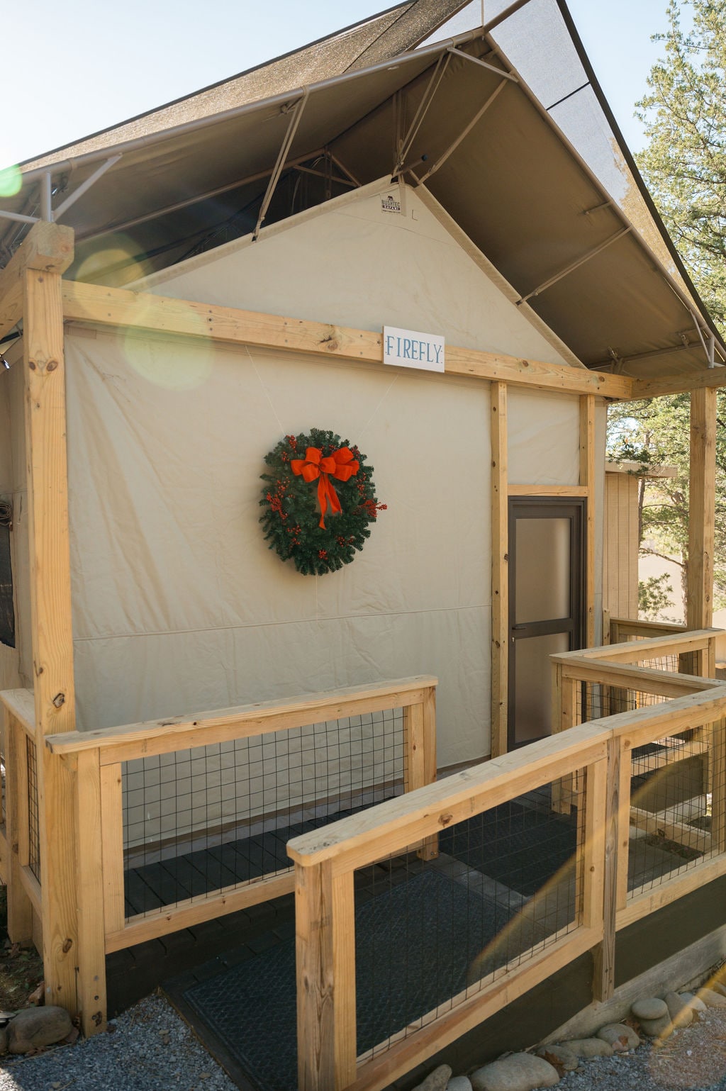 This safari tent is the definition of GLAM. Decked out with vintage ’50s-- furniture, fur, feathers, pinks, golds, and chrome. Glam exudes the romance of the 50’s movies and Marilyn Monroe. The lighting is warm and cozy, and the beds are luxurious. One Queen and a twin w/ trundle daybed (gel memory foam mattresses). Tiny sink, water, k-cup coffeemaker, microwave, mini-fridge, RV toilet* for nighttime convenience, (Seasonally: fans, heater, heated blankets) provided. (NO PETS in this unit!)
