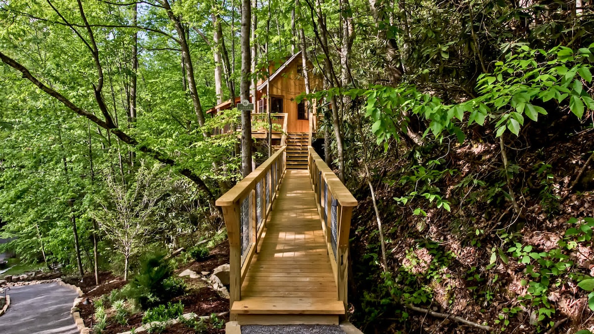 This place is anything but ordinary. The Smoky Mountain Treehouse is the only one of its kind in the area - a luxurious, custom-built treetop experience with a spectacular view and the comforts of home, and then some. Cross the 40’ swinging bridge and enter the grand arched door where you’ll be transported to a place where the nostalgia of a treehouse is combined with the luxury of modern day. This unique property has everything you’ll need for a romantic or adventure-filled getaway!