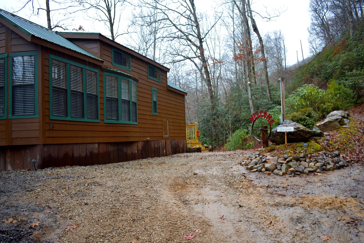 "Southern Comfort" has been recently renovated. It has all the charm expected of a quaint farmhouse cabin style. Centrally located between downtown Bryson City & Cherokee and only minutes from the Great Smoky Mountains National Park. Relax in the bubbling hot tub, roast marshmallows or play a game of cornhole. Enjoy the majestic views from the privacy of your own decks. Check out Deep Creek's waterfalls, hiking trails, tubing or take a train ride on the Great Smoky Railroad.