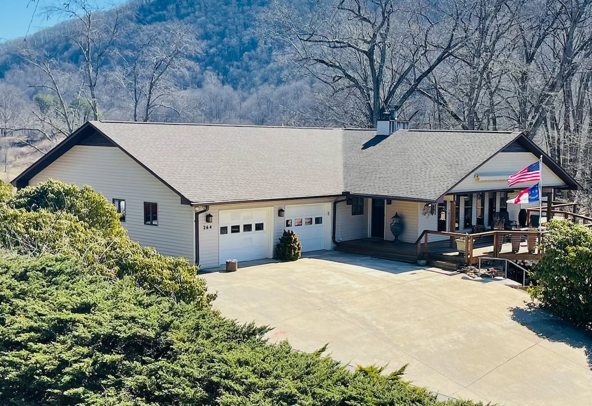 Beautiful Mid-Century Modern, Strong Wi-Fi Family Farmhouse with Panoramic Valley, Mountain and Sunset Views. Farmhouse boasts a fireplace, 2 large living areas, 3 bedrooms, 2 baths, sleeps 6. Easy 3 mile paved drive to Main Street, Franklin. Many wonderful cultural, outdoor activities in Historic Franklin; hub to Asheville, Highlands, Scaly Mountain, Nantahala, Cherokee, Western Carolina University. After a busy day of adventure, enjoy a beautiful Mountain Sunset and a sky full of stars.