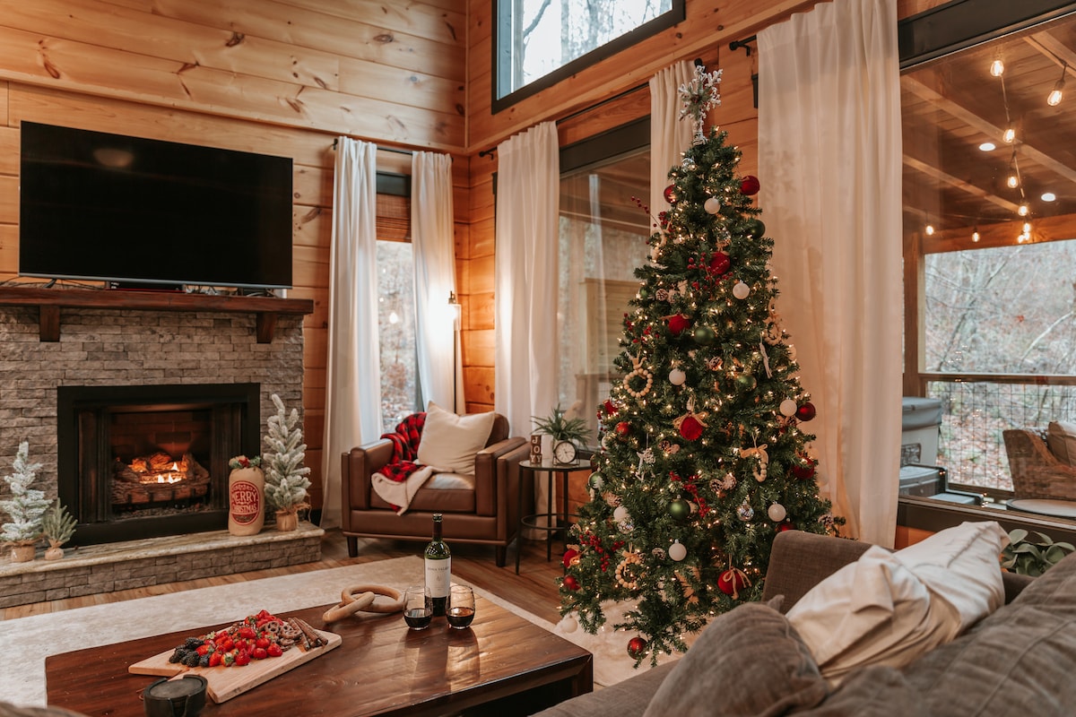豪华树顶度假屋!热水浴缸、火坑和景观!