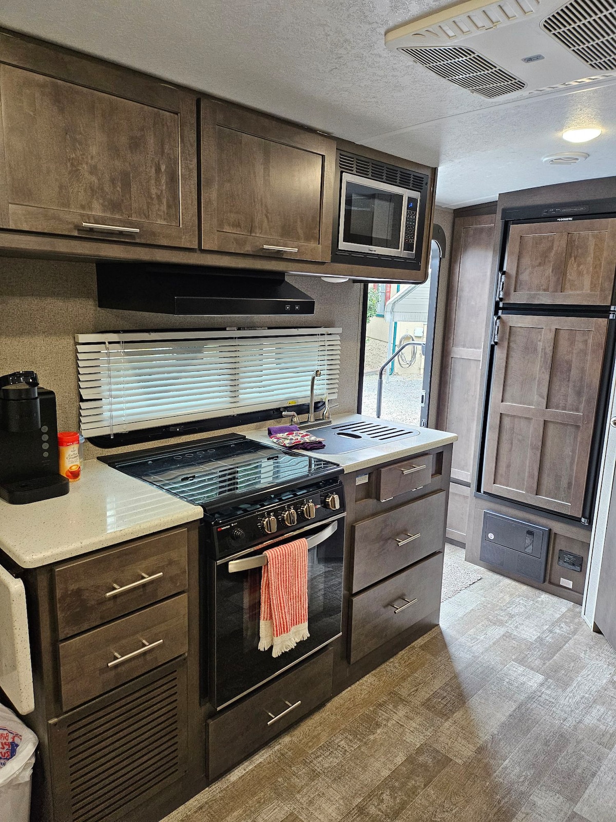 Minutes to Downtown Gatlinburg, this brand new RV camper is the perfect way to explore the great outdoors in style and comfort. With top-of-the-line amenities, this camper will make your next camping trip one to remember. The interior features a spacious living area with comfortable seating and a fully-equipped kitchen, complete with a refrigerator, stove, and microwave. The bedroom has a King-size mattress with 3 twin lofts upstairs and a pullout queen couch. See you around the campfire!