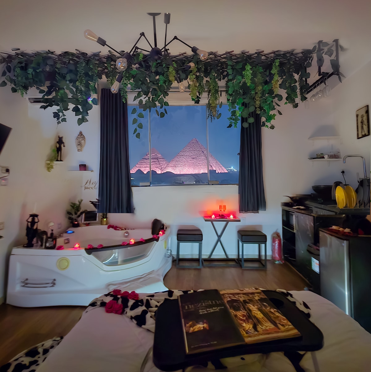 Welcome to a one-of-a-kind retreat just 5 minutes from the Pyramids! This studio offers panoramic Pyramid views and a private hot tub. The space features Pharaonic-inspired design, with unique decor and architectural details that create a historic, cozy ambiance. Enjoy a queen bed, dining area, kitchenette, and private bathroom. Guests also have access to the shared rooftop with stunning views for an unforgettable stay.