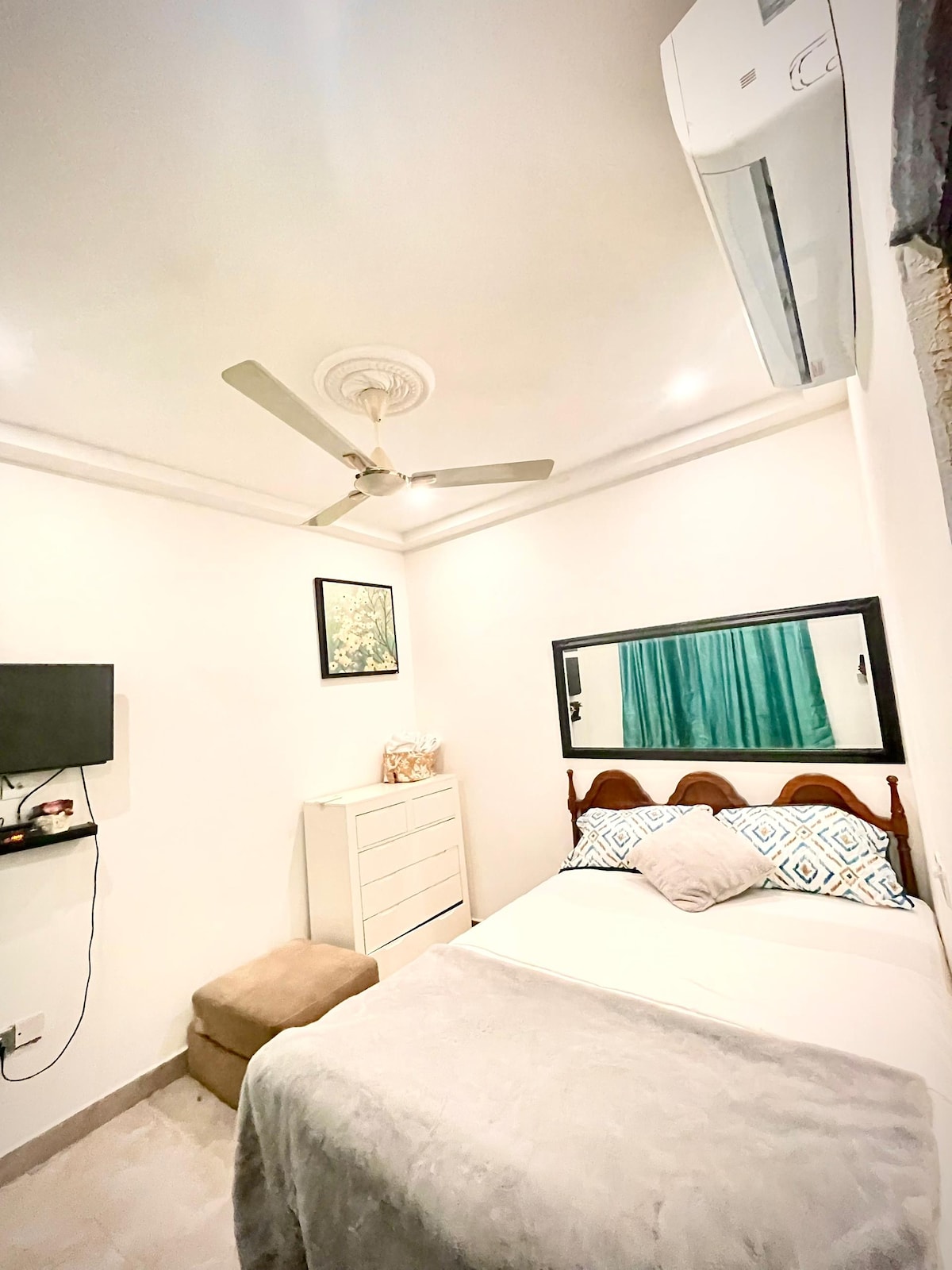 The suite is posh & clean. White walls with wood trims, beautiful portraits, arts & flowers decorate the whole space. The suite comes with a very comfy double bed and comfy sofa too. Unlimited Wifi Favorite movies via Netflix Air conditioner Bathroom Water Heaters A fully functional kitchen is also inclusive.