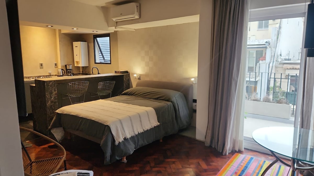 Located in a light, clean, warm, ventilated and spacious micro city center ideal for a getaway. A study of 40 mt. decorated with style (viamonte street between reconquista street (pedestrian) and May 25). Accessible on foot to Puerto Madero, Pacific Galleries and all the tourist attractions offered by the city and public transport (buses and metro). Excellent for travelers or couples who want to get to know the city on foot and get to know the day and night attractions that the city offers.