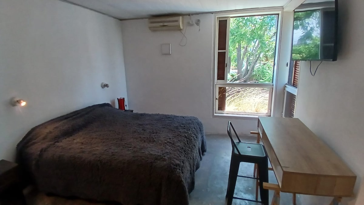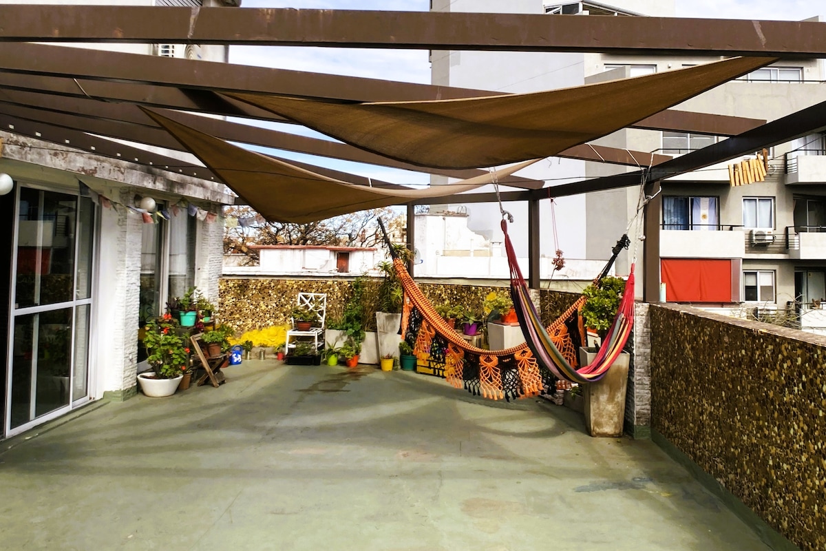 Desconecta de tus preocupaciones en este espacio amplio y sereno. Cerca de bares, restaurantes de moda, malls, buses y metros. Tiene todo lo necesario para una estadía perfecta: - Excelente wifi -Sommier queen -Aire acondicionado -TV '43 -Sofá - Mesa comedor/espacio de trabajo -Microondas, anafes eléctricos pava y tostadora eléctricas -Refrigerador -Amplio vestidor con espacio de guardado -Baño en suite con ropa blanca - Terraza con mesa y sillas para disfrutar del aire libre