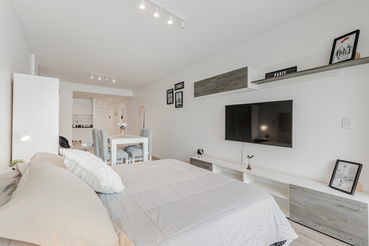Minimalistic studio located in a hotel flat will offer you the best experience. Location: City center next to touristic points like Puerto Madero, La Boca, Casa Rosada, Palermo. Mobility: Close to bus stops and subways, free bikes in the entry. Views: Woman's bridge and river plate, also you'll see the sunrise and sunset. Amenities: Wi-Fi (Private connection) Meetings room and a small cinema Sauna (dry and wet), Jacuzzi and a massage table (separate service) Complete Gym Swimming pool