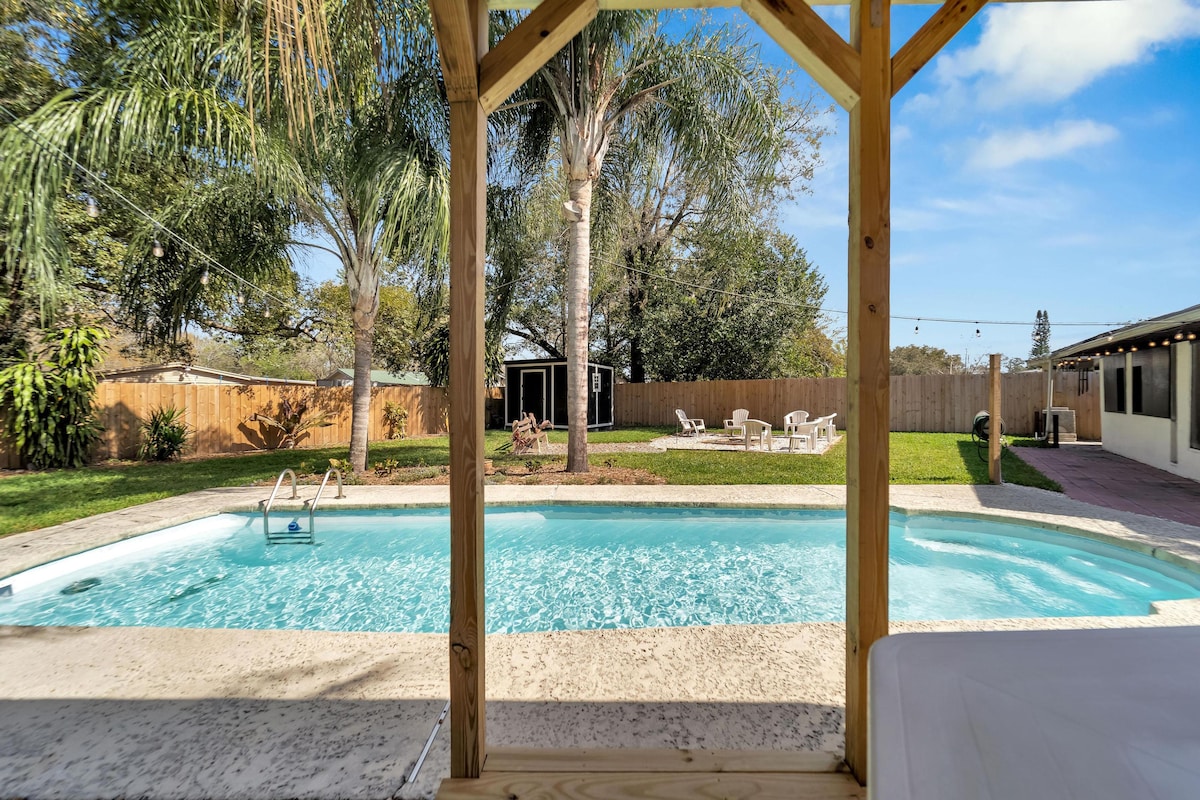 Tampa Oasis - 3BR/2BA(Half Bath with outdoor shower with hot water), Heated Pool, and Hot Tub (Saltwater) Welcome to convenience and relaxation near Tampa Airport! This 3-bed, 2 bath home comfortably sleeps 8 with a pullout bed. Enjoy a heated pool, hot tub, and outdoor shower + TV. Proximity to the airport, Tampa's attractions, and more. Amenities include Wi-Fi, washer/dryer, and smart home tech. Book now for a memorable Tampa stay!