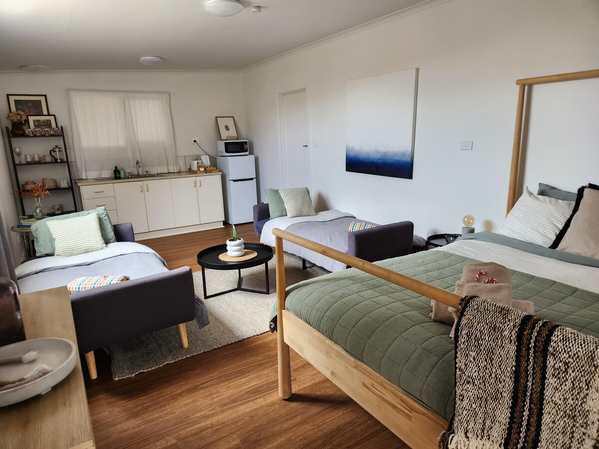 Hit the beach or town centre in a 4 minute drive from this quiet, cosy studio. Hear the birds singing as you wake to your breakfast basket provided on arrival. Locally sourced produce includes Adelia muesli, sourdough, LardAss butter, sparkling water, juice, milk and jam. Relax the afternoon away in your cosy lounge or outdoor area with a local wine you have picked up on your adventures. On cooler evenings enjoy the warmth of your outdoor firepit.