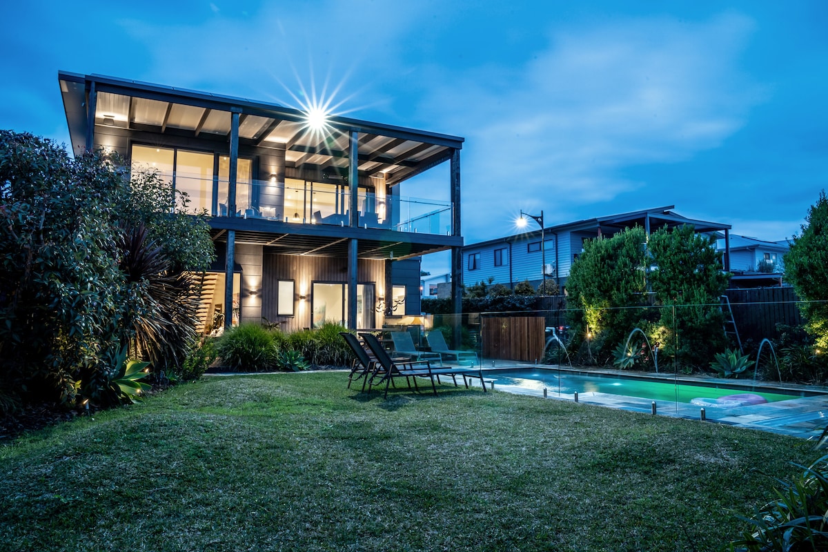 Brand new luxury pool house; Barwon Heads with Lift Heated pool + outdoor entertaining area 5 bedrooms; 2 master suites + 3 bathrooms 2 large living areas for families + groups Designer kitchen w seamless indoor–outdoor flow Heating, cooling + fans throughout Double garage w drive-through access for jet ski/ small watercraft Smart TVs, gas log fireplace + Wi-Fi Perfect for wedding guests, family holidays, coastal retreats Minutes to beaches, cafes, river, golf courses + wedding venues