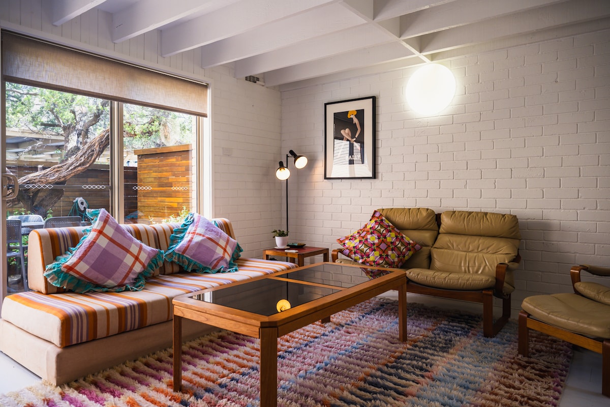 A two minute stroll to the beach and shops. This unique, stylish and comfortable stay has it all. Gorgeous gardens, lovely dining area nestled in a flower and herb filled, secure yard. Pets welcome (pending approval on application). Two double bedrooms, very comfortable beds. Split system air con / heater, cosy fireplace and outside fire pit incase it gets chilly. High quality kitchen facilities with everything you need. Generous boardgame collection.