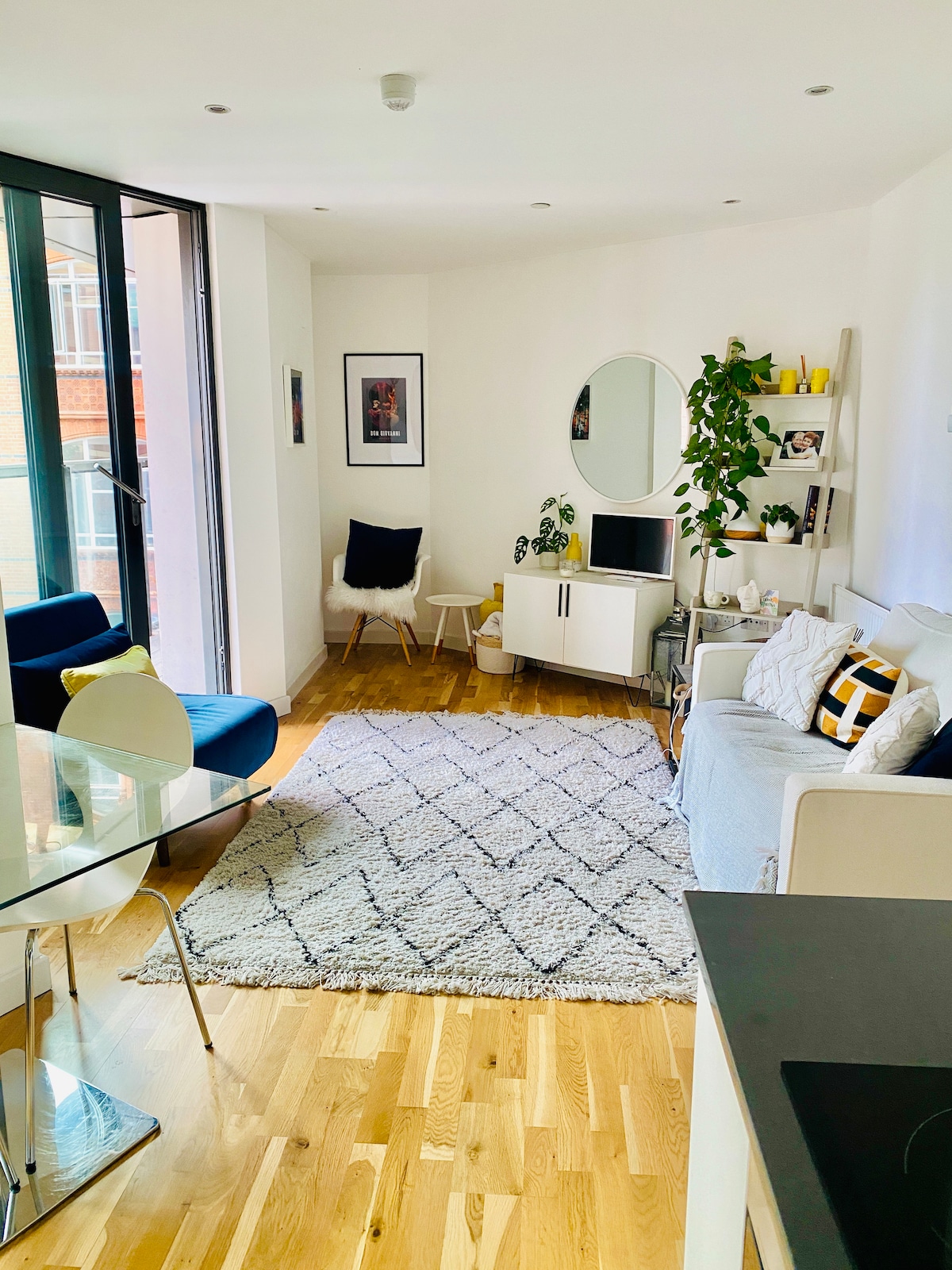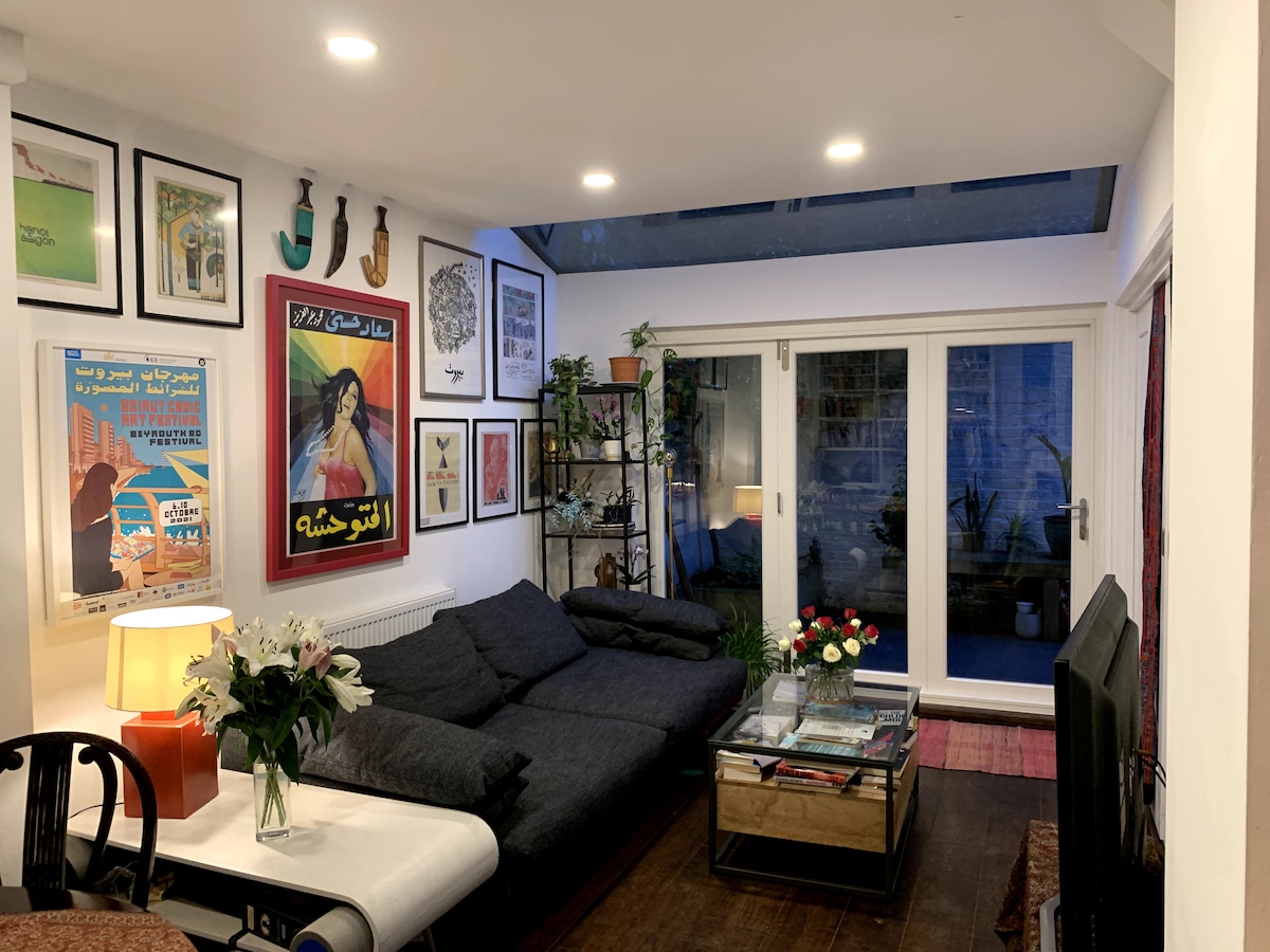 Beautiful, peaceful, one bed in a fabulous location near Mare St and Victoria Park. 5 min walk to Cambridge Heath station & London Fields, 15 min (or 5 min bus/cycle) to Bethnal Green tube. Lots of buses nearby, also e-bikes & electric car charging just outside. Off road parking space with grass and trees out front. Mid century modern style with brutalist details, suits those who value an intentional sanctuary. Lots of plants & light! Very comfy king bed. Vitamix blender for those who know 😍