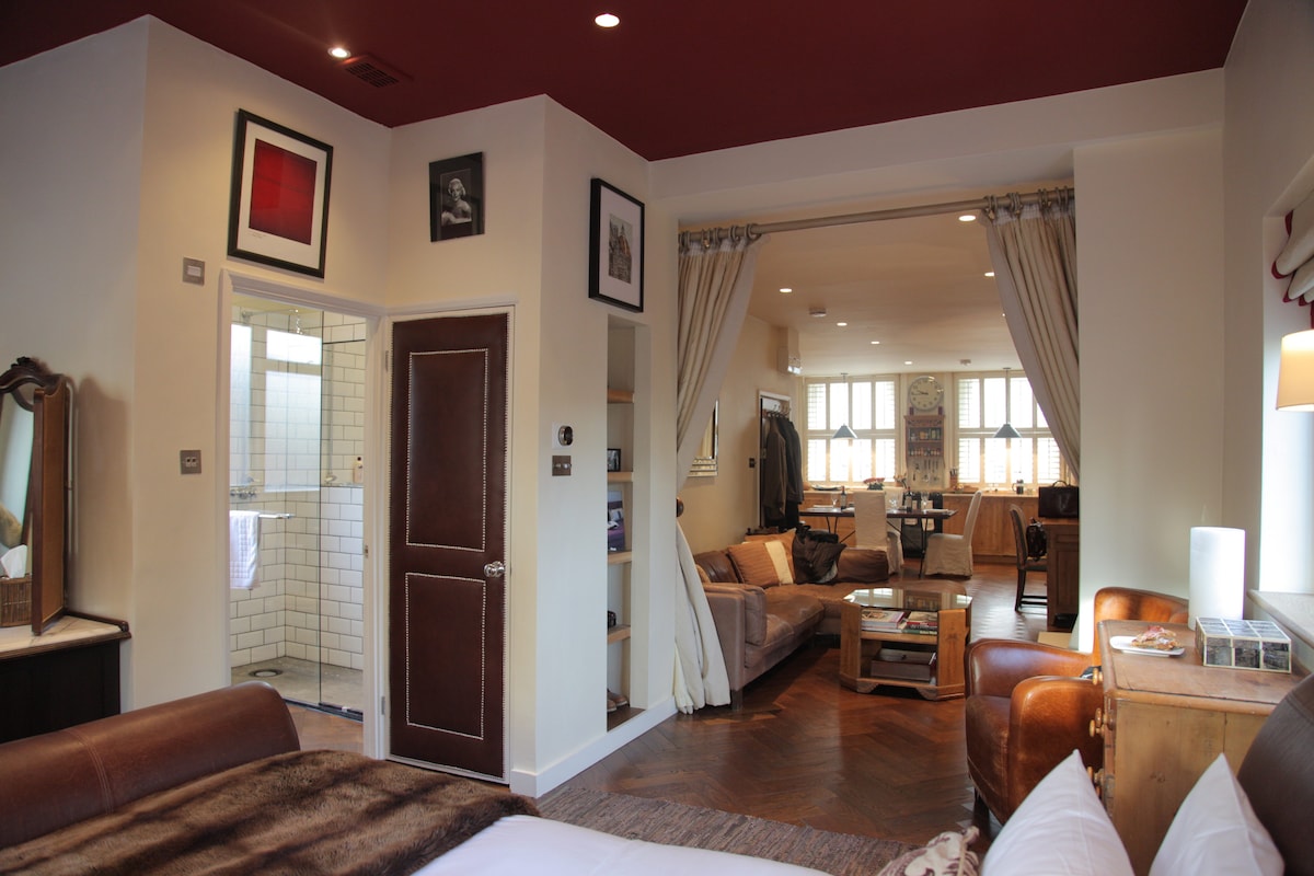 Wake up & lift the automatic blinds directly from your SUPER KING SIZE BED & be captivated by the VIEW of the beautiful Darent Valley unfolding before you through the picture windows. SNUGGLE in a cosy armchair with a book, listen to your favourite music or EXPLORE many footpaths along the valley. Stroll through the fields to Otford & Shoreham villages, visit HISTORIC HOUSES & vineyards or simply stay at home & enjoy a spacious studio apartment whilst staring at the sunset with a glass of wine