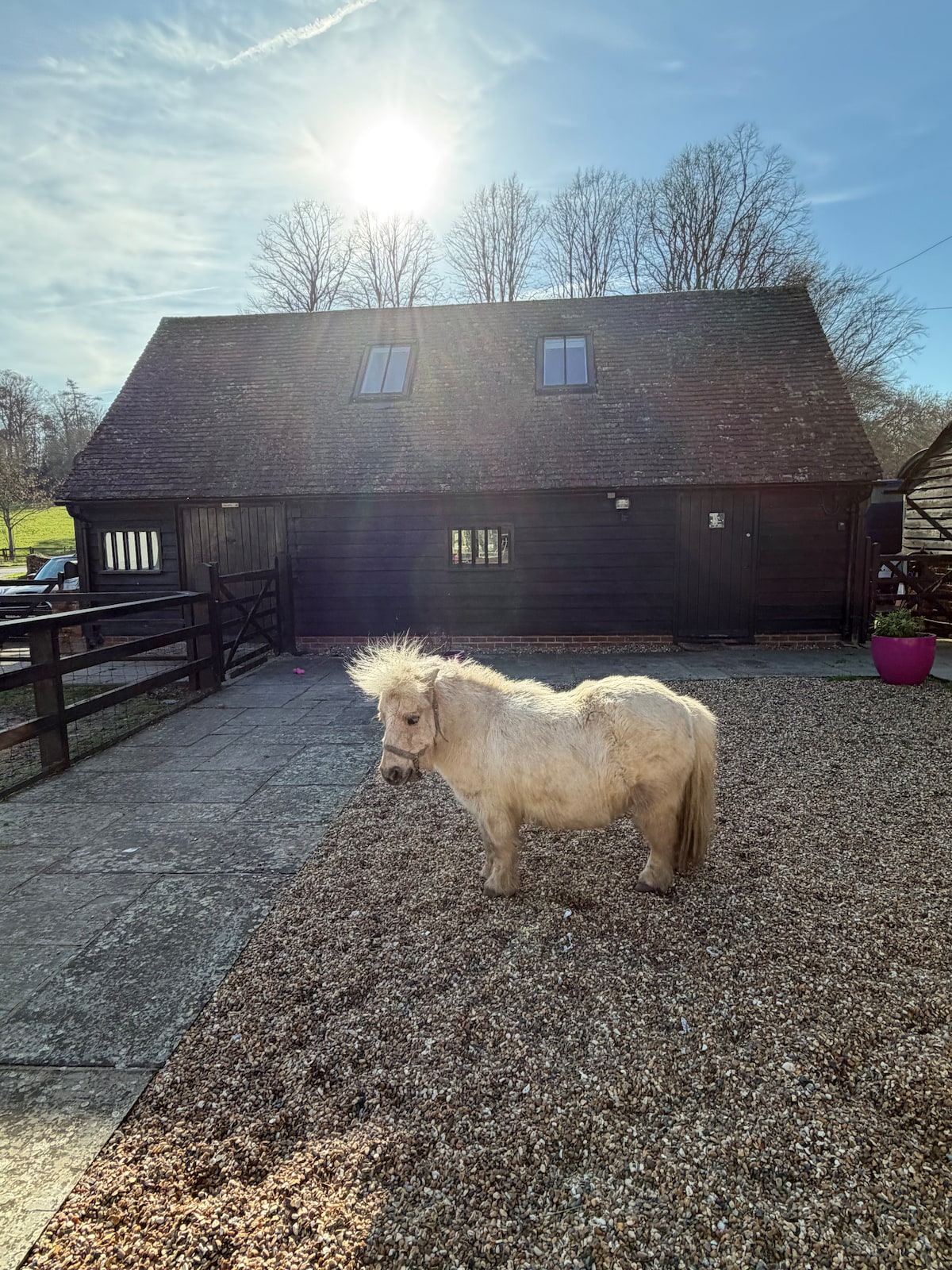 In the year of the horse, a chance to stay in a self-contained cottage, on a horsey farm between the Surrey Hills and Epsom downs. The perfect place to relax and get in touch with nature. The accommodation is a self-contained stable conversion which you have all to yourselves, accessed from a small quiet stable yard. A lounge, small kitchen, downstairs bedroom, upstairs an open plan bedroom leading to the bathroom. Bathroom only accessed via upstairs bedroom.