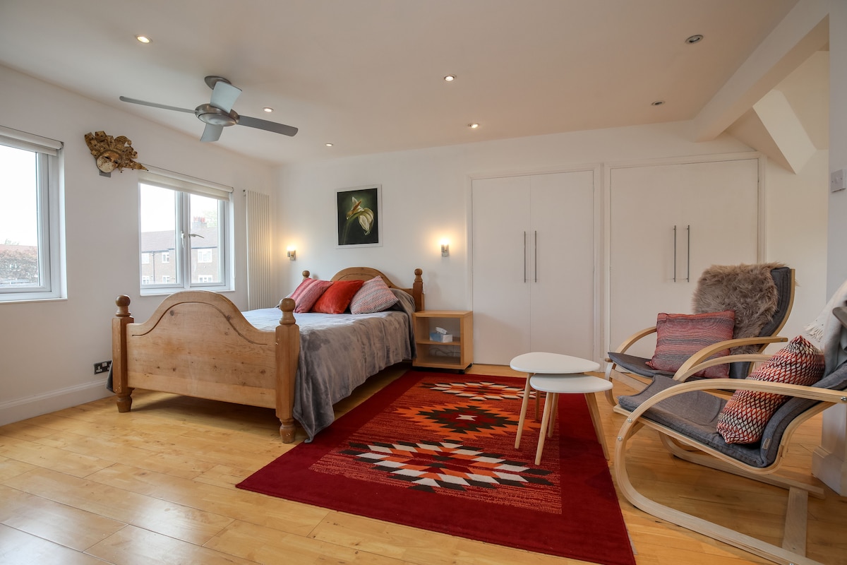 This top floor studio is a gem, close to central London. It is a tranquil, spacious hideaway in Finchley.The tube station is 7 mins walk away and takes 25 mins to all London highlights.Separate bathroom+kitchenette The kingsize bed has elegant hotel bedlinen with luxurious duvets & Alpaca throws with a choice of plump feather or anti-allergy pillows.There is off street parking available and easy links to major airports. Quiet location but close to cafes and shops.