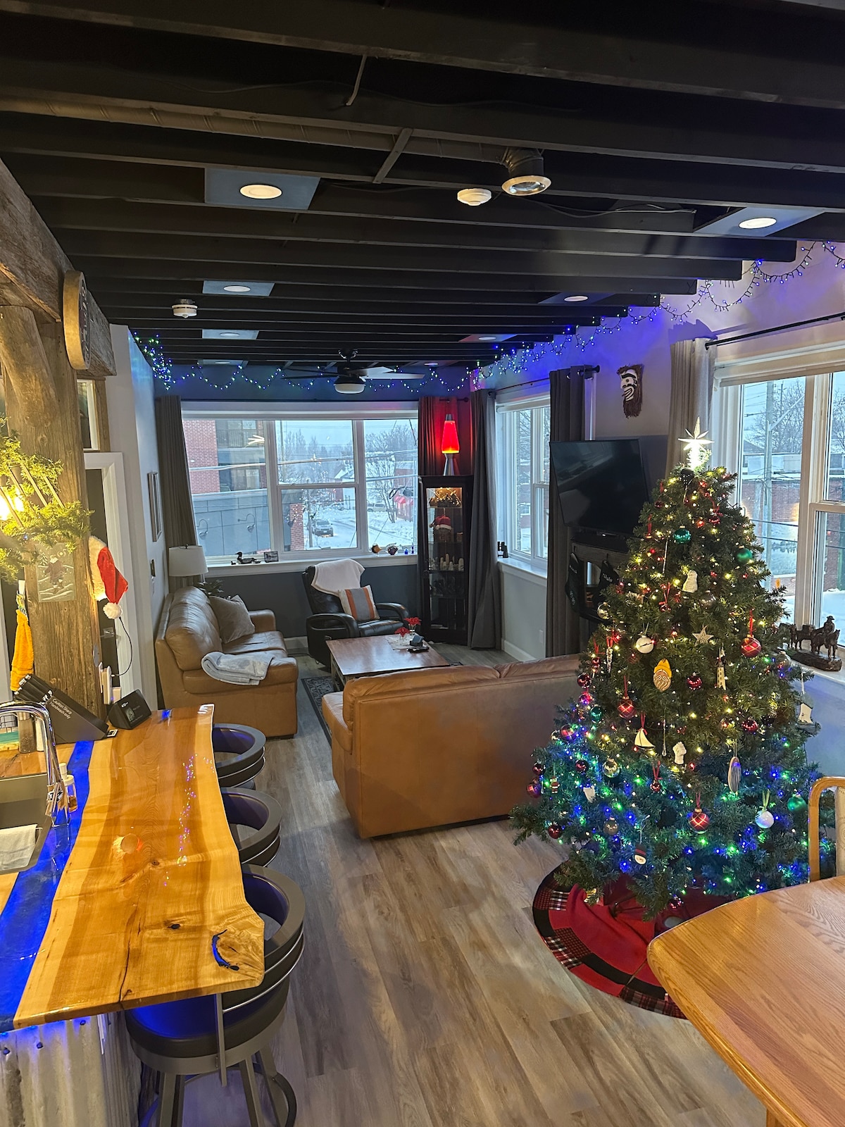 Open concept with a stunning view of the ski hill and a wood-burning fireplace in the center surrounded by leather sofa. This chalet is a dream destination for skiers. In the summer, bring your own watercraft to enjoy Calabogie Lake, (deeded access, boat launch dock with parking and large loading area), or have fun at the Peak Resort. The set up is also ideal for a medium-size family get together.