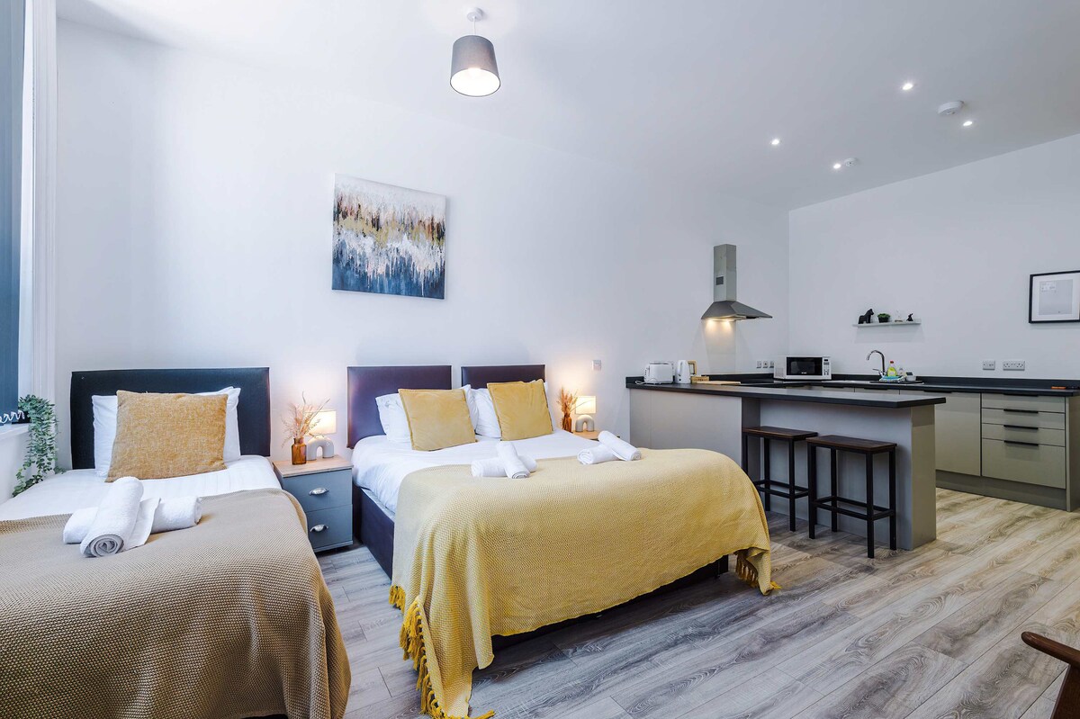 2 Bed serviced apartment, Greater Manchester Situated close to the extremely popular Beech Road shops, bars & restaurants - essentially making it one of the coolest places to live in the region, this very modern and stylishly designed two-bedroom apartment comes fully furnished with everything you would want in a home away from home. Security camera's are installed covering the entry doors and the communal living room area for the safety of the property and our guests.