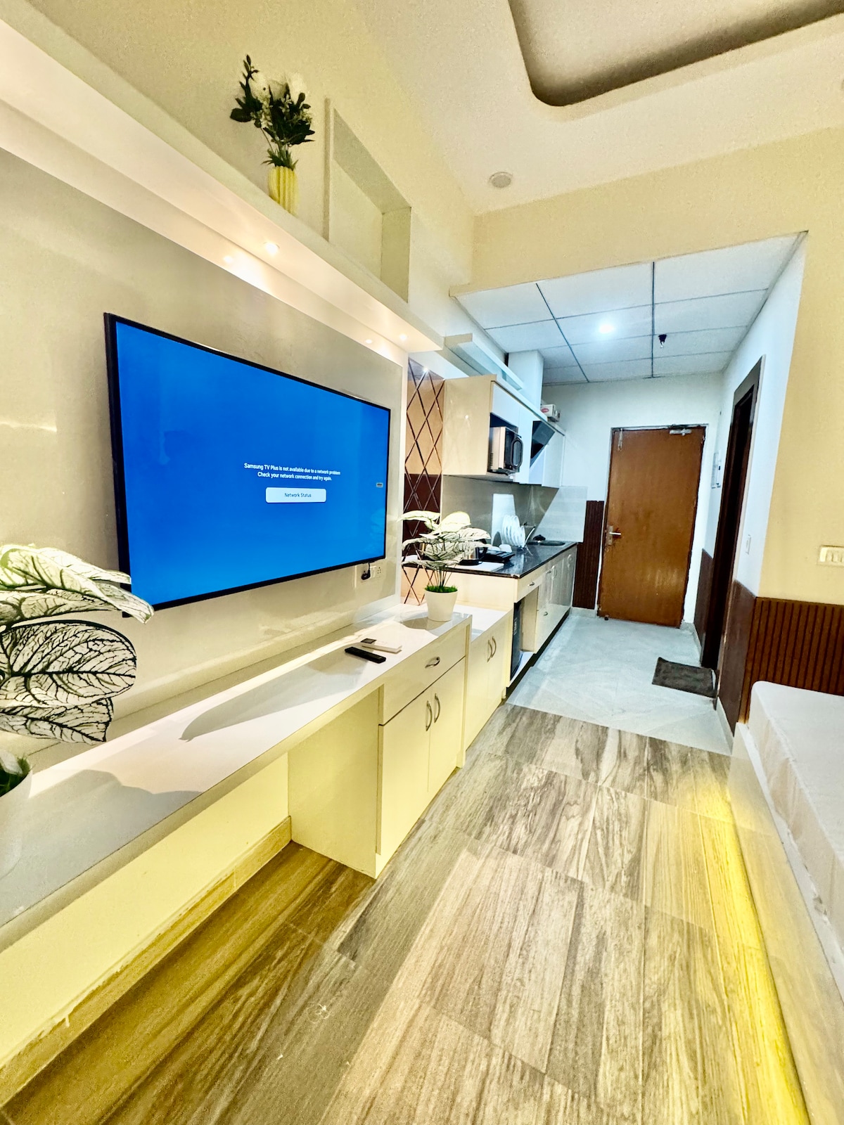 Fully furnished luxurious studio apartment with all modern amenities available in Greater Noida near Metro station. Luxurious , Specious and Couple friendly studio in Greater Noida Near Expo Mart. What You’ll Love: ✔ Unique Interior – Enjoy the Mesmerizing Interior. ✔ Modern Comfort – A beautifully furnished space with a comfy bed, cozy seating, and stylish decor. ✔ Fully Equipped Kitchen – Cook your favorite meals with ease. ✔ Fast WiFi & Smart TV – Stay connected and entertained.