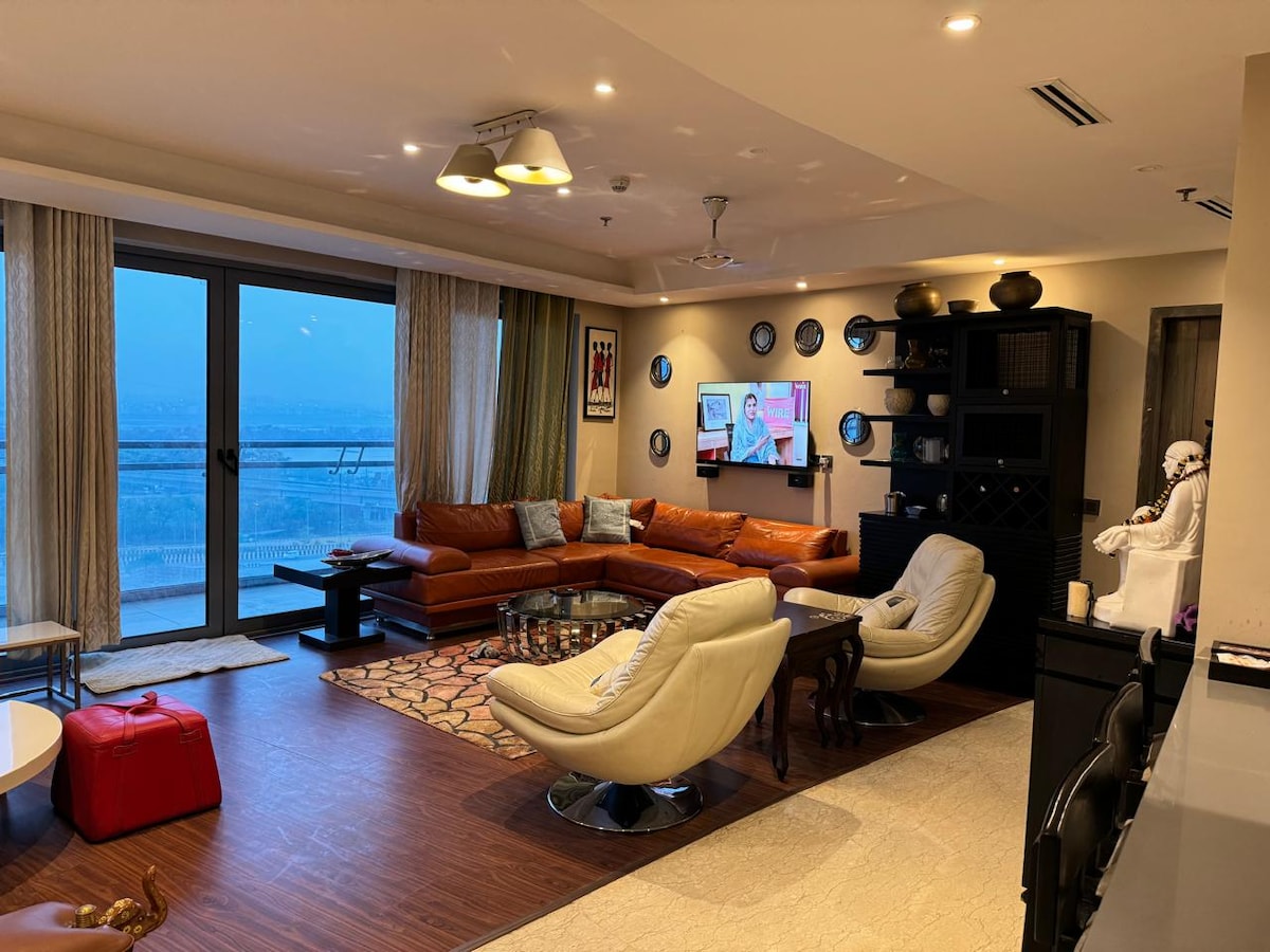 Introducing our exquisite luxury studio apartment: Nestled in the heart of the city, this opulent studio boasts modern elegance and unparalleled comfort. The open-concept design invites you into a spacious haven, bathed in natural light from the large windows that offer breathtaking city views. This apartment is on the 41st floor in one of the tallest sky scraper in Delhi - NCR. The apartment has a river facing view from the balcony!!