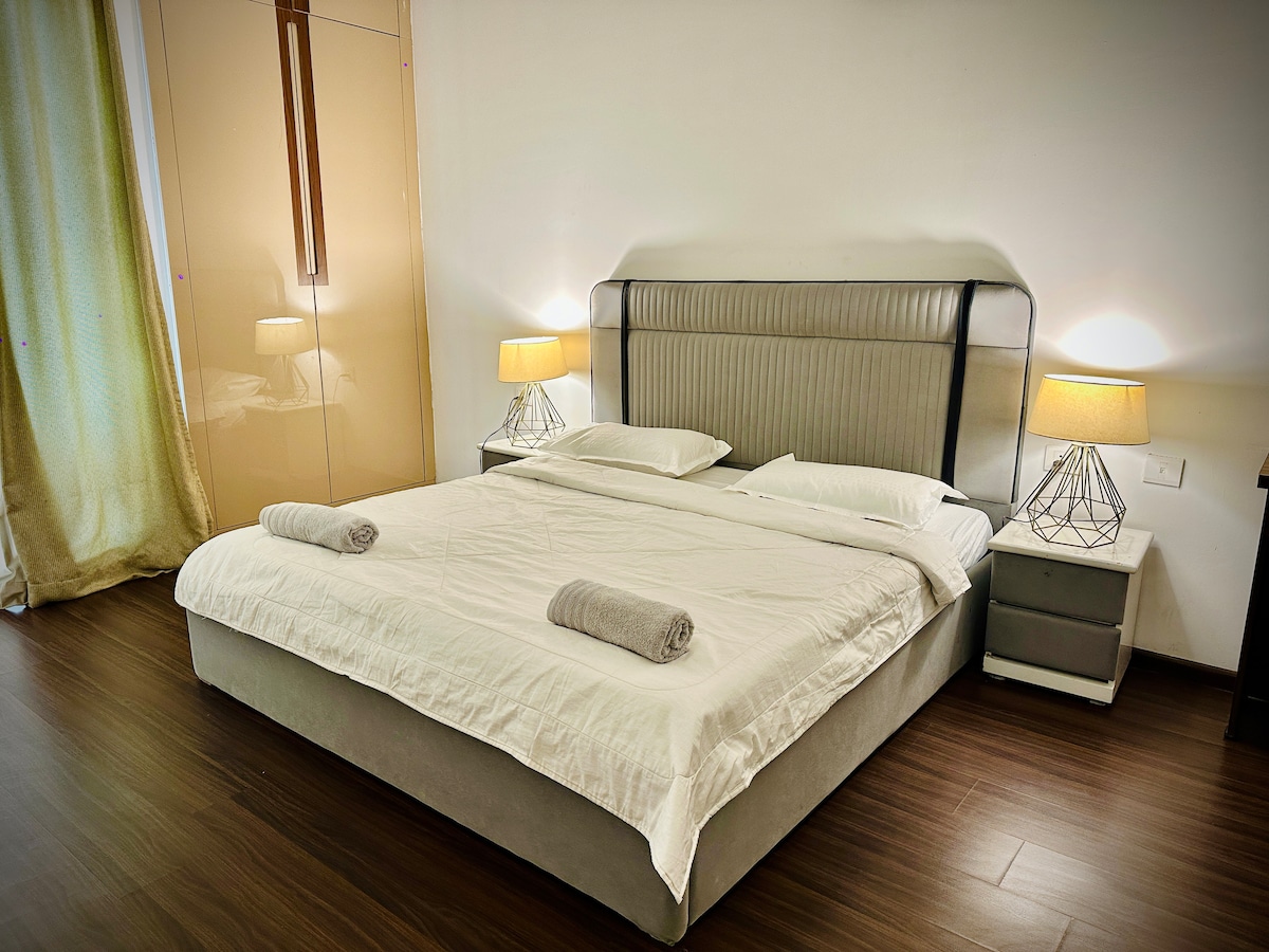 Kick back & relax in this calm & luxurious studio with the warmth of home & the vibe of a high-end hotel. Furnished with a plush Queen-size bed & modern décor. Amenities: 24/7 Grocery Store Modern Kitchenette High-Speed WiFi & TV Secure Parking outside tower but 24/7 Secured The first 2 floors has commercial shops, offering: Laundry Services Salon Café Medical Store Easy access to the India Expo Mart, Buddh International Circuit. Perfect for couples, solo travellers, or business partners.