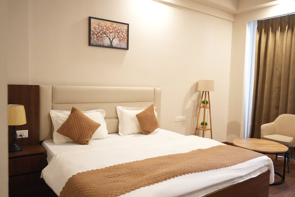 Kick back & relax in this calm & luxurious studio with the warmth of home & the vibe of a high-end hotel. Furnished with a plush King-size bed & modern décor. Amenities: 24/7 Grocery Store Modern Kitchenette High-Speed WiFi & TV Secure Parking outside tower but 24/7 Secured The first 2 floors has commercial shops, offering: Laundry Services Salon Café Medical Store Easy access to the India Expo Mart, Buddh International Circuit. Perfect for couples, solo travellers, or business partners.